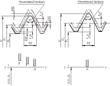 Рис. 31. Схемы полей допусков внутренней резьбы: а – с основными отклонениями E, F, G; б – с основным отклонением Н