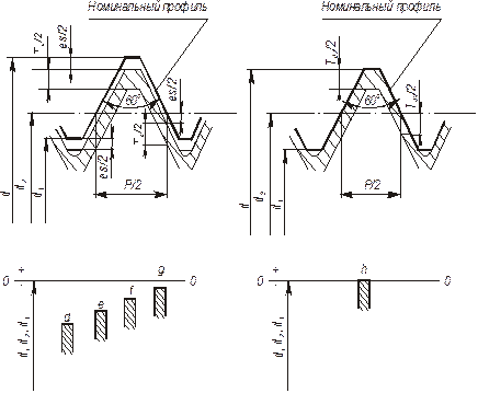 Рис. 32. Схемы полей допусков наружной резьбы: а – с основными отклонениями d, e, f, g, б – с основным отклонением h
