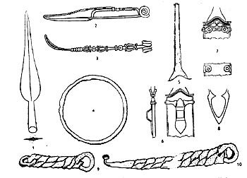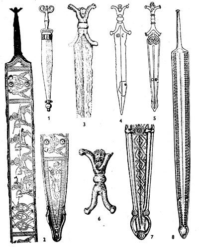 Рис. 17. Велка Маня в р–не г. Нитра, Словакия. Кельтская парная могила №38 (воин со щитом, у ног кости кабана) и могила №14 (захоронение женщины в могиле, обложенной деревом). Раскопки Б. Бенадика. Важным рубежом в развитии для кельтского мира на европейском континенте было вторжение кимвров. К концу II века это германское племя продвигалось из северной Ютландии на юг в поисках новых мест для поселения. Их напор около 113 г. отразили бойи, по всей вероятности где–то западнее или юго–западнее Чехии. Кимвры потом повернули к скордискам на Дунае, а оттуда на запад к таврискам, где в 113 г. разбили римлян у Нореи. Напор кимвров вытеснил также гельветов с их прежней территории между Рейном и Дунаем в современную Швейцарию. Кимвры, соединившись с тевтонами, которые, возможно, были кельтским племенем, занимавшим территорию к югу от Майна, стали бичом не только для кельтов, но и для римлян. На кельтской территории в конце II века существовали укреплённые центры, оппидумы, и, по всей вероятности, в это тревожное время уделялось особое внимание их сооружению. В 109 г. кимвры одерживают победу на территории секванов и в союзе с другими племенами продвигаются до самой Аквитании. Дважды были разбиты римские армии, в 107 и 105 гг., и Италия опасалась прямого вторжения в страну. Наконец в 102 г. римский полководец Марий разбил тевтонов у г. Аквы Секстиевы, а кимвры, которые через Бреннерский перевал проникли в долину реки По, в следующем году были разгромлены недалеко от Милана у г. Верцеллы войсками Мария и Катула. Галлия в латенский период и во времена Цезаря Самые подробные сведения о галлах в современной Франции и Трансальпийской Галлии оставил нам Г. Ю. Цезарь в своих «Записках о Галльской войне», которую он вёл в 58—51 гг. до н.э. Всю Галлию он разделяет на три больших области: в одной из них жили галлы, в другой аквитаны, а в третьей белги. Таково было положение в последнем столетии до нашей эры. Первоначально кельтские поселения не занимали всей территории современной Франции; лишь постепенно кельты продвигались от бывшей территории курганов на запад и юго–запад. В более позднее время в Галлии известно много крупных и мелких племён, известны поселения некоторых из них, в большинстве случаев носящие характер укреплённых городищ (оппидумы). На запад от гельветов (они жили в современной Швейцарии) на другом склоне Юрской возвышенности находились секваны (Франш–Комте), ещё западнее — лингоны, а также эдуи, между реками Соной и Луарой, на территории которых на холме Бовре находился известный оппидум Бибракта. Их соседями на западе в поречье Луары были битуриги (оппидум Аварик); в качестве обитателей этой области называют и бойев. В Оверни и по реке Алье жили арверны, многочисленное племя с большими вооружёнными силами, занимавшее в течение известного времени ведущие позиции; на их территории находился город Герговия, известный по битвам в 52 г. при Цезаре. По реке Изер от современного Лиона (Лугдун) до самого Женевского озера простиралась территория аллоброгов, когда–то славившихся своими вооружёнными силами. Из других значительных племён следует упомянуть на севере сенонов в поречье Сены юго–восточнее современного Парижа. По Мозелю жили треверы. Аквитания в начале римского периода представляла собою небольшую провинцию от Пиренеев к холмам в бассейне Гаронны. 