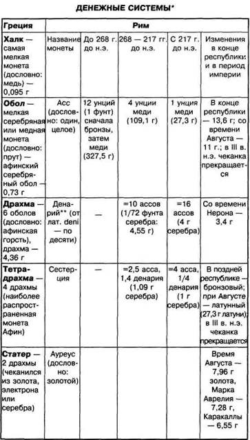 Примечания. * При всех изменениях в весе монеты как в Греции, так и в Риме сохранялась пропорция по отношению к весовым величинам мины и таланта: 1 мина = 100 драхм = 600 оболов = 100 денариев = 400 сестерциев = 10000 (с 217 г. до н. э. – 16000) ассов; 1 талант = 60 мин = 6000 драхм = 3600 оболов = 6000 денариев = 24000 сестерциев = 10000 (с 217 г. до н. э. – 96000) ассов. ** Римский денарий соответствовал греческой драхме, поэтому греческие авторы обычно и в рассказах о римской истории заменяют денарий словом «драхма».