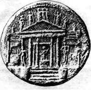 Фасад храма Конкордии (Согласия) на Форуме. Монета, выпущенная в ознаменование восстановления храма Тиберием.