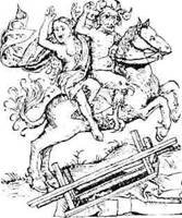 Ведьма на коне дьявола. Немецкая гравюра XV в. Типичный лубок, но не XV, а XVII–XVIII веков. Лошадь рабочая, тягловая, так как подкована на четыре ноги. Уздечка на лошади кавалерийская, с трензелями и двойным чумбуром. Оказывается, даже дьявол управлять лошадью без уздечки не может. Но без седла, охлюпкой, нечистая пара держится на скаку хорошо. Немецкая гравюра может оказаться карикатурой на известный в те годы конный памятник или на фигуру батальной картины. Фантазии художника не выходят за пределы обыденного: коровьи рога, птичий коготь, куриная лапа, собачья морда… Перевернутый стол на переднем плане показан в прямой перспективе, ножки стола соединены досками ВНАХЛЕСТ, то есть ГВОЗДЯМИ. А что, если это карикатура на Петра I и Екатерину II.