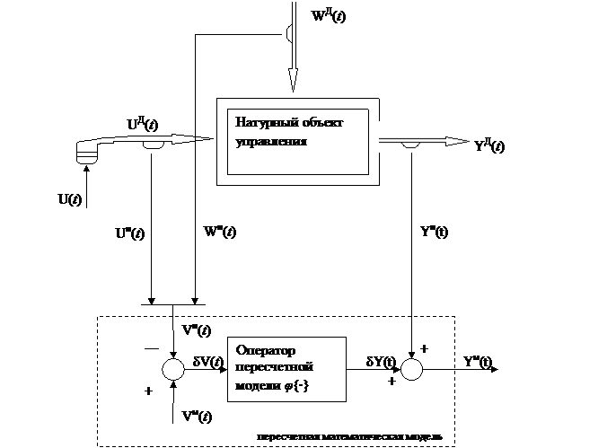 Рисунок 1 - Структура пересчетной модели При таком моделировании возникает задача сочленения натурных данных с модельными. Ее осуществляют с помощью математических моделей специального класса, называемых пересчетными математическими моделями (рис 1.). Эти модели «работают» в приращениях к натурным данным и позволяют ответить на вопрос, что было бы на выходе объекта исследования, если вместо натурных входных воздействий действовали бы другие модельные значения входных воздействий. Натурно – математическую модель управления объекта с использованием пересчетной модели в общем виде можно записать следующим образом. Y М(t) = Y Н(t) + δY (t) (6) dY (t) = δV (t) = V М(t) – V Н(t) (8) Пересчетная модель рассчитывает абсолютные значения. Оператор пересчетной модели не рассчитывает абсолютные значения выходной переменной, а пересчитывает отклонения выходных воздействий в зависимости от отклонений входных воздействий. Оператор пересчетной модели φυ{·} имеет то преимущество по сравнению с математической моделью, что структурно он является более простым. Это объясняет тем, что с его помощью преобразуются отклонения входных воздействий относительно их натурных значений, т.е. диапазоном изменения δV существенно меньше. В самом общем виде математические модели можно представить с помощью следующих выражений: Y = Ф 1 { W, U, A, t }; (9) Y = Ф 2 { V, A, t }; (10) Во втором выражении вместо W и U стоит символ V – вектор входных воздействий без разделений его на управляющие и внешние. По этому отличию можно сразу же отметить, что первое выражение представляет собой математическую модель преобразующих каналов объектов управления, т.к. здесь в явном виде выделены управляющие и внешние воздействия. Вторым выражением представлена математическая модель объекта исследования, который не является объектом управления, т.е. не является частью системы управления, т.к. в нем отсутствует разделение входных воздействий на внешнее и управляющее. В зависимости от подхода к построению моделей выделяют два класса математических моделей: 1) математические модели внутреннего механизма процесса или математические модели «в большом»; 2) функциональные или кибернетические модели или модели «в малом». Будем в дальнейшем обозначать через Ф { ∙ } модели внутреннего механизма процесса, а через φ { ∙ } – функциональные (кибернетические) модели. Выражения (9) и (10) записаны с помощью заглавных символов, то есть речь идет о математической модели поведения объекта во всем большом диапазоне изменения входных и выходных воздействий. Такие модели называют математическими моделями «в большом» или математическими моделями внутреннего механизма процессов, происходящих в объекте. Как правило, такие модели детально отображают все требуемые стадии преобразования энергии или вещества в объекте. Функциональные модели представлены с помощью выражений (11)-(14): y = φ1 {w, u, a, t} (11) y = φ2 {v, a, t} (12) y = φ3 {w, u, a} (13) y = φ4 {v, a} (14) 11, 12 – динамические; 13,14 – статические. Модели типа (11)-(14) называются кибернетическими или функциональными. Они отражают поведение объекта в малом диапазоне изменения входных и выходных воздействий. Эти модели отражают лишь внешнее соответствие, причинно-следственную связь между входными и выходными воздействиями и совершенно не затрагивают процессы преобразования энергии или вещества внутри объект