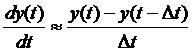 то это уравнение в дискретном времени имеет вид: y(i) = c1 y (i - 1) + c2 v (i - l) - это рекуррентное дифференциально-разностное уравнение. где l – дискретное запаздывание Переход от непрерывного дифференциального уравнения к дифференциально-разностному осуществляется за счет замены производной ее приближенным уравнением. Таких приближений может быть несколько. Наиболее простые из них: