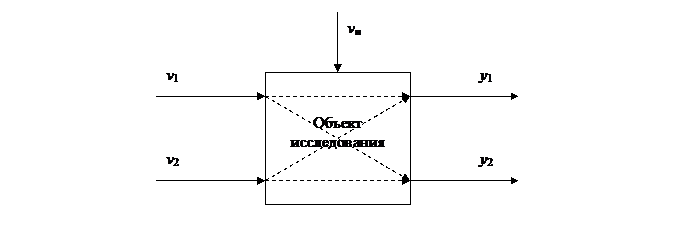 Рисунок 12 - Структура объекта исследования Объект имеет 2 входных учитываемых воздействия v 1 и v 2, неконтролируемые входные воздействия v н, т.е. те воздействия, которые влияют на состояние объекта, но являются неконтролируемыми и, следовательно, не могут быть учтены моделью. Объект имеет 2 выходных воздействия y 1 и y 2. При этом предполагается, что у 1 зависит от v 1 и v 2, и у 2 также зависит от v 1 и v 2: