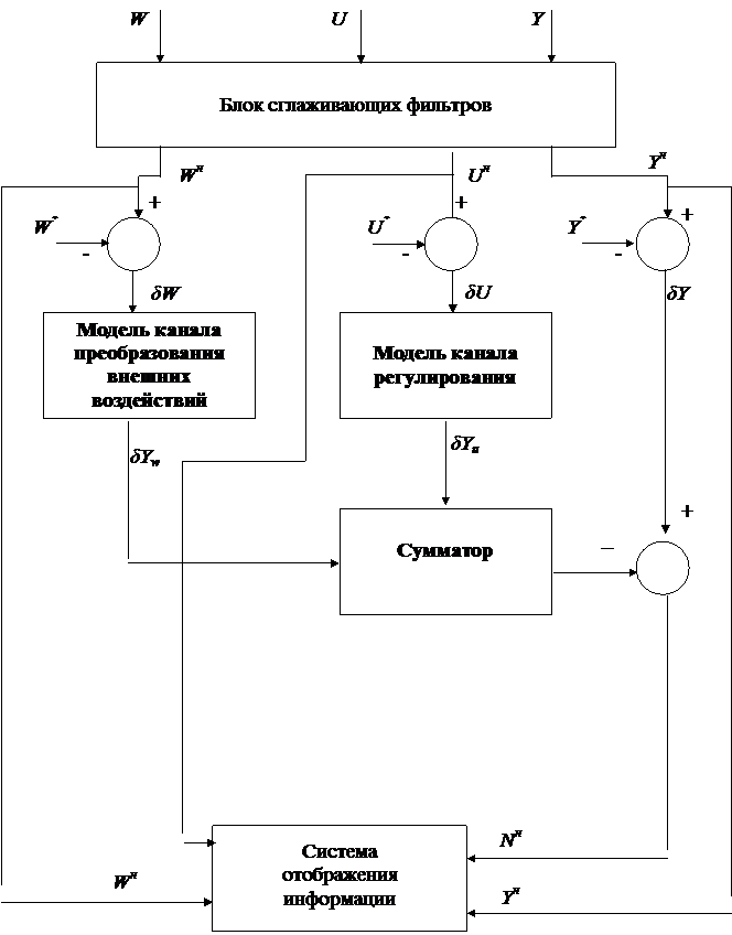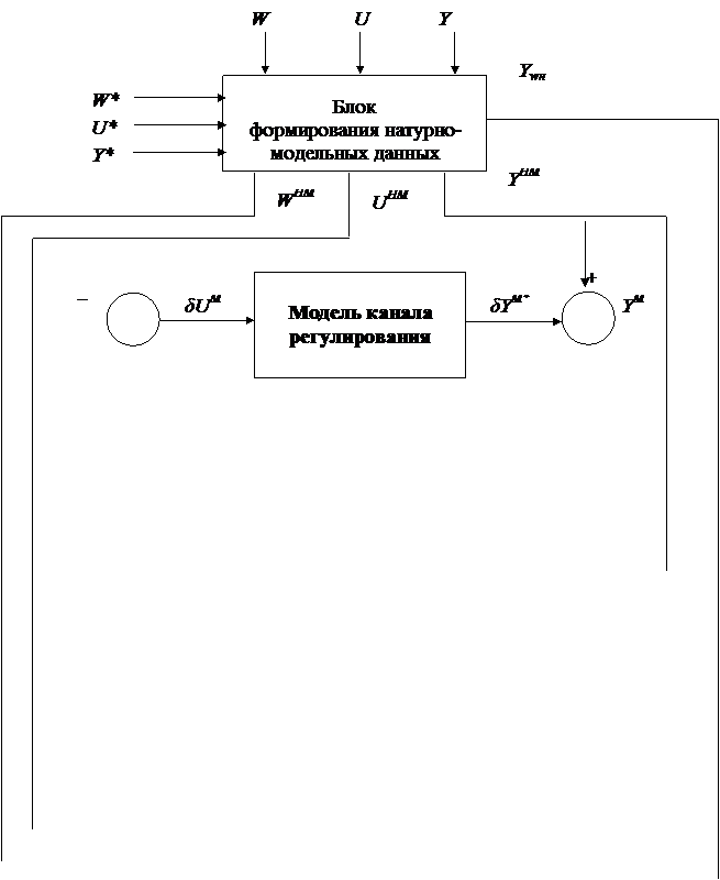 Реализация натурно-модельного режима функционирования объекта управления осуществляется оператором по команде с пульта управления. В этом случае подключается в работу блок формирования натурно-модельных данных, где осуществляется формирование возмущающих (в том числе и приведённых к выходу объекта управления) и управляющих воздействий с желаемыми свойствами по схеме, представленной на рис. 23. При формировании возмущающих и управляющих воздействий с желаемыми свойствами используют следующие данные: · о желаемых изменениях входных воздействий WМ* и UM*, а также приведенных к выходу объекта управления возмущений NM*; · сглаженные оценки натурных изменений входных и выходных переменных объекта управления WH, UH, YH, NH; · модели каналов преобразования отклонений регулирующих Формирование UM* и WM* осуществляется по единой схеме, а именно: 1). Первоначально определяются отклонения δUM* и δWM*, δUM*= UM*- UH; (132) δWM*= WM*- WH; (133) 2). Затем осуществляется расчёт натурно-модельных значений контролируемых возмущений WНМ и управлений UНМ c учётом указанных выше ограничений, а именно: UHM=UH+δUM, (134) где