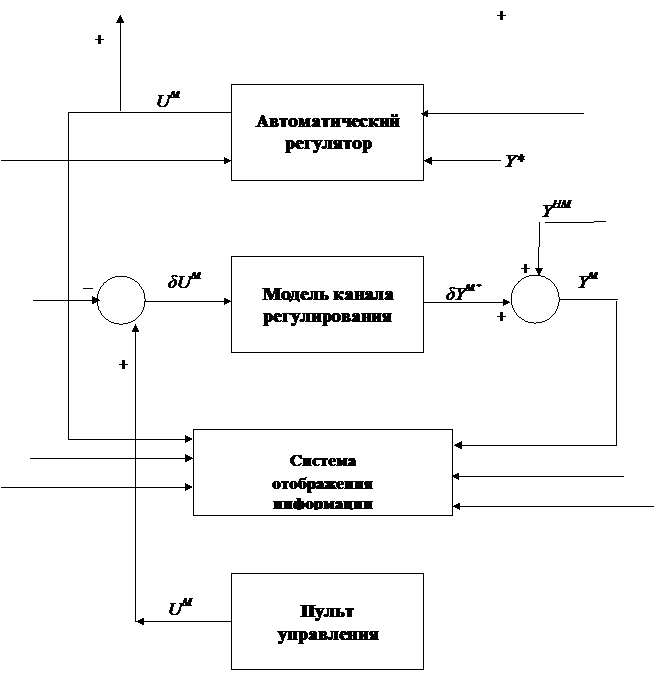 где Схема, поясняющая реализацию задачи испытания системы автоматического регулирования как с натурными, так и натурно-модельными воздействиями, приведена на рис. 16 и 11. Указанные схемы являются практически одинаковыми, с той лишь разницей, что на последней присутствует блок формирования натурно-модельных данных, предназначенный для получения реализаций WHM, UHM, YHM, Ywн с желаемыми свойствами. Схемы включают в себя: · пересчётную модель канала регулирования для расчётного определения текущих значений YM с использованием реализаций UM, UH (или UHM), YH (или YHM). В предлагаемом варианте испытательно-наладочного и обучающего комплекса в качестве пересчётной модели используется последовательное соединение инерционного звена первого порядка и запаздывающего звена; · испытуемый автоматический регулятор, качество работы которого требуется оценить и по возможности повысить в процессе испытания и настройки; · система отображения информации, состоящая из печатающего устройства, графопостроителя и экрана. На рис. 18 и 19 приведены схемы испытательно-наладочного и обучающего комплекса, работающего в режиме обучения с использованием как натурных, так и натурно-модельных воздействий. Как и в предыдущем случае, эти схемы полностью аналогичны как для режима обучения с использованием натурных воздействий, так и натурно-модельных. В случае обучения с использованием натурно-модельных воздействий применяется вместо блока оценивания блок формирования натурно-модельных воздействий. Пульт управления используется для реализации управляющих воздействий, сформированных обучаемым. При этом следует обратить внимание, что эти воздействия наносятся на втором, активном периоде обучения. В связи с этим весь процесс обучения разбивается на два периода: 1. Пассивный, когда с помощью системы отображения информации обучаемому демонстрируются характерные состояния объекта управления, типовые нарушения и соответствующие им реализации входных и выходных переменных; 2. Активный, когда обучаемому предоставляется возможность формирования и реализации на натурно-модельном объекте необходимых управляющих воздействий. Рис. 21 и 22 поясняют работу испытательно-наладочного комплекса в том случае, когда реализуются одновременно оба режима - и испытания, и обучения - как с использованием натурных, так и натурно-модельных воздействий. Как видно из рисунков, испытательно-наладочный и обучающий комплекс представлен в виде двухканальной системы. В первом канале решается задача испытания и настройки системы, а во втором канале – обучения. Рисунок 15 - Укрупнённая структура ИНиОК