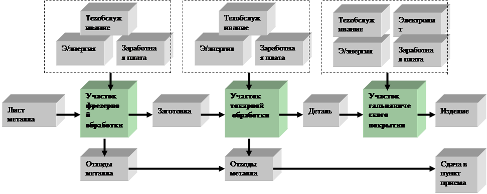 В связи с тем, что производственный цикл изготовления конечного изделия предполагает прохождение листа металла через заготовительный участок, участки фрезерной, токарной обработки, а также линию гальванического покрытия, необходимо провести расчет затрат, возникающих на каждом из участков. Суммарная себестоимость будет определена как сумма всех затрат.
