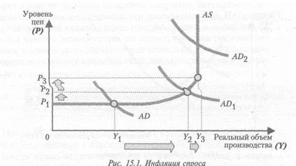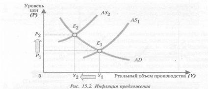 На графіку ми бачимо, що крива сукупного попиту зміщується в право на проміжній і вертикальній ділянках, спостерігається зростання загального рівня цін, який, на проміжному відрізку супроводиться зростанням реального об'єму виробництва, тобто інфляція попиту може бути позитивним явищем, якщо тільки тоді коли темпи зростання цін співпадають з темпами зростання виробництва. На вертикальній ділянці спостерігається інфляція без збільшення реального об’єму виробництва. Отже суть інфляції попиту полягає в тому, «що надто багато грошей полює на надто малу кількість товарів» Якщо причини дисбалансу знаходяться на стороні сукупної пропозиції, то така інфляція називається інфляцією пропозиції. Інфляцію, що виникає в наслідок зростання витрат у періоди високого рівня безробіття і неповного використання виробничих ресурсів, називають інфляцією витрат, або інфляцією пропозиції. Збільшення витрат виробництва на одиницю продукції зменшує прибутки та обсяг виробництва, який фірми готові запропонувати за наявного рівня цін. У результаті спадає пропозиція товарів і послуг, що підвищує рівень цін. У цьому випадку ціни роздувають витрати, а не попит, як то відбувається за інфляції попиту. Важливими джерелами такої інфляції є збільшення номінальної заробітної плати і зростання цін на сировину та енергію. Інфляцію пропозиції також можна представити графічно мал.(1.1.2)