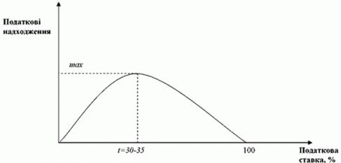 “Крива Філіпса” яскраво показує, що, чим вищий рівень безробіття, тим нижчий рівень інфляції і, навпаки, чим нижчий рівень безробіття, тим вищі темпи розвитку інфляції. В усіх випадках регулювання інфляції зводиться до вибору альтернативних варіантів: або менша зайнятість без інфляції, тим вища зайнятість в умовах інфляції. Інфляція вважається ціною, яку мають сплачувати ті, хто продає на ринку свою робочу силу [ 7, с.68 ]. Головне місце у фінансово-кредитному макроекономічному регулюванні в умовах ринкової економіки займає механізм оподаткування. Сьогодні важливим його атрибутом є “крива Лаффера”, яка вказує на якісний та кількісний взаємозв`язок між сумою податкових надходжень до державного бюджету Т та податковими ставками t (Рис. 3.2.2). Вона знайшла відображення в макроекономічному регулюванні багатьох країн ринкового господарства.