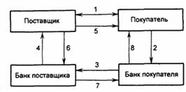 Рис. 2.1 Аккредитивная форма расчетов с предварительным депонированием средств 1 - заключение договора о расчетах с использованием аккредитивной формы расчетов с предварительным депонированием средств на отдельном счете в банке; 2 - передача в банк заявления на открытие аккредитива, о депонировании средств, а затем списание средств со счета покупателя; 3 - перевод средств в банк поставщика и зачисление средств на счет «Аккредитивы»; 4 - сообщение поставщику об открытии аккредитива; 5 - поставка товара (оказание услуг); 6 - расчетные документы, подтверждающие отгрузку товара (оказание услуг); 7 - сообщение об использовании аккредитива направляется в банк покупателя; 8 - сообщение покупателю об использовании аккредитива При установлении между банками корреспондентских отношений непокрытый (гарантированный) аккредитив может открываться в исполняющем банке путем предоставления ему права списывать всю сумму аккредитива с ведущегося у него счета банка-эмитента (рис. 2.2) [47].