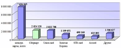 Согласно данным таблицы 1, за 2012 г. выросли остатки денежных средств физических лиц на счетах банковских карт Сбербанка России, достигнув на 01.01.2011 г. 14,7 млрд.руб. и 133,3 млн. долларов США (на 01.01.2010г. соответственно 8,44 млрд. рублей и 98,4 млн. долларов США). Прирост за год составил соответственно 58% и 74%, что обеспечило увеличение доли средств, привлеченных на счета банковских карт, в общем объеме привлеченных от физических лиц средств с 2,33% до 2,74% [37]. Распространению всех видов карт способствовало дальнейшее развитие инфраструктуры их обслуживания. Большое внимание в отчетном периоде уделялось проблеме создания универсальной сети обслуживания банковских карт. Так 148%-й рост количества банкоматов, обслуживающих карты международных платежных систем, обусловлен, в первую очередь, тем, что банки активно внедряли программное решение для банкоматов, которое позволяет на одном устройстве обслуживать карты международных платежных систем и микропроцессорные карты СБЕРКАРТ. Увеличение количества пунктов выдачи наличных и установка банкоматов во всех основных промышленных центрах России способствовало росту объема операций в них по международным картам, выпущенным сторонними эмитентами, и картам Сбербанка России, выпущенным в других КБ. Объем снятия наличных денежных средств в 2013 г. других КБ по картам Сбербанка составил 13,9 млрд. руб. (за 2010 год – 8,6 млрд. руб.), в том числе по картам СБЕРКАРТ – 8,35 млрд. руб. и международным картам - 3,56 млрд. руб. соответственно. Объем выдачи наличных средств по международным картам, выпущенным сторонними эмитентами, за отчетный период превысил 4,79 млрд. рублей (за 2010 год – 2,3 млрд. руб.). В 2013 году общее количество карт, выпущенное и обслуживаемое российскими банками, возросло на 45% и достигло 15,4 млн. карт по сравнению с 10,6 млн. карт на начало года (рис. 2) [45].
