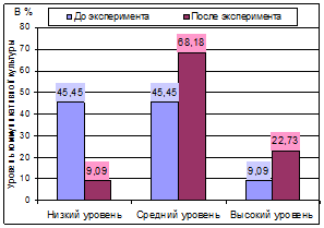 Рисунок 2 – Уровень коммуникативной культуры учащихся до и после реализации проекта «Воспитание коммуникативной культуры учащихся» Как видим из рисунка, наши ожидания оправдались, изменились отношения ребят между собой. Младшие школьники стали чаще заботиться друг о друге и замечать, когда окружающим требуется помощь. В целом повысился уровень коммуникативной культуры. Таким образом, уровень сформированности коммуникативной культуры у учащихся, зависит от выбранного организационно-методического обеспечения и правильно организованной воспитательной работы.