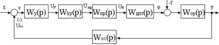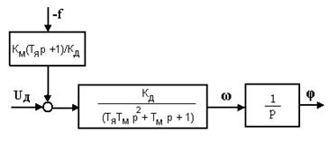 Рис. 14 Величина Kу приводится для каждого варианта в таблице №3. В случае применения для измерения параметров регулирования термопары, тахогенератора и др. возможно сравнение напряжений задания и обратной связи на входе операционного усилителя с коэффициентом усиления Ку. Структурная схема будет такой же, как на Рис.14. В соответствии с передаточными функциями ДПТ с независимым возбуждением по управляющему и возмущающему воздействиям (Рис.2,7,8) структурная схема имеет вид, представленный на Рис.15. Выходной величиной двигателя в данном случае является перемещение. Если выходной величиной ДПТ является скорость (Рис.4 и 5), то у передаточной функции и соответственно на структурной схеме отсутствует интегратор 1/p.