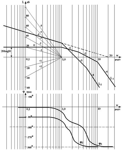 Построение ведется на полулогарифмической бумаге и графики л.а.х. и л.ф.х. располагаются друг под другом. Главным достоинством логарифмических частотных характеристик является возможность построения их во многих случаях практически без вычислительной работы. Особенно удобно использовать логарифмические частотные характеристики при анализе всей системы, когда результирующая передаточная функция после разложения на множители приводится к виду: