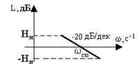 Известны разные подходы к установлению запасов устойчивости [2,4,5]. Необходимо помнить, что чем выше в системе частота среза, тем больше вероятность того, что при расчетах скажется погрешность не учитываемых малых постоянных времени отдельных устройств САУ. Поэтому рекомендуется с ростом wср искусственно увеличивать запасы устойчивости по фазе и модулю. Так для двух типов САУ рекомендуется пользоваться приведенной в [ 2 ] таблицей. При высоких требования к качеству переходных процессов, например, 20% <sпер < 24%; рекомендуются следующие средние показатели устойчивости: jзап=45°, Hм=16 дБ, -Hм=14 дБ. При пониженных требованиях к качеству переходных процессов, например, 25% <sпер < 45%; рекомендуются следующие средние показатели устойчивости: jзап=30°, Hм=12 дБ, -Hм=10 дБ. На рис.23 приведен вид среднечастотного участка желаемой л.а.х., ширина которого обеспечивает требуемые запасы устойчивости.