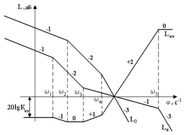 Рис.24. ЛАХ располагаемой L0, желаемой Lж разомкнутой системы и последовательного корректирующего устройства Lку