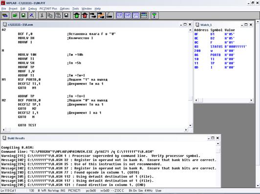 Исходя из технического задания, предлагаемое МКУ выполняет сравнение вводимых с 2 датчиков аналоговых сигналов и сравнение их между собой, далее в зависимости от результата сравнения, выполняются определенные действия. То есть, если U1=U2, то установка флага F0 в «1» и переход на метку А1, если же U1<>U2 – то установка флага F0 в «0» и переход на метку А0. Так как в данной разработке сравнение чисел и управление выходным сигналом выполняется с помощью программы, написанной на языке Ассемблер, то необходима проверка работоспособности этой программы. Проверка работоспособности программы осуществлялась с помощью среды MPLAB v 3.40. Для этого необходимо выполнить следующие действия: Запустить оболочку MPLAB v 3.40 (Пуск\Программы\Microchip MPLAB\MPLAB). Появится окно, изображенное на рис. 5.1. прокомпилировать и выполнить проект.