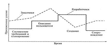 Потенциальные пользователи работают с этим прототипом, определяя его сильные и слабые стороны, о результатах сообщают разработчикам ПП. Таким образом, обеспечивается обратная связь между пользователями и разработчиками, которая используется для изменения или корректировки спецификации требований к ПП. В результате такой работы продукт будет отражать реальные потребности пользователей. Жизненный цикл разработки ПП начинается с разработки плана проекта (на рис. этапу планирования соответствует центр эллипса), затем выполняется быстрый анализ, после чего создаются база данных (если, конечно, она используется в ПП), пользовательский интерфейс и выполняется разработка необходимых функций. В результате этой работы получается документ, содержащий частичную спецификацию требований к ПП. Данный документ в дальнейшем является основой для итерационного цикла быстрого прототипирования. В результате прототипирования разработчик демонстрирует пользователям готовый прототип, а пользователи оценивают его функционирование. После этого определяются проблемы, над устранением которых совместно работают пользователи и разработчики. Этот процесс продолжается до тех пор, пока пользователи не будут удовлетворены степенью соответствия ПП, поставленным перед ним требованиям. Затем прототип демонстрируют пользователям с целью получения предложений по его усовершенствованию, которые включаются в последовательные итерации до тех пор, пока рабочая модель не окажется удовлетворительной. После этого получают от пользователей официальное одобрение (утверждение) функциональных возможностей прототипа и выполняют его окончательное преобразование в готовый ПП. Модель прототипирования рекомендуется применять в следующих случаях: - требования к ПП заранее неизвестны, - требования не постоянны или неудачно сформулированы; - требования необходимо уточнить; - нужна проверка концепции; - существует потребность в пользовательском интерфейсе; - выполняется новая, не имеющая аналогов разработка; - разработчики не уверены в том, какое решение следует выбрать 4. Модель быстрой разработки приложений, или RAD-модель (RAD — Rapid Application Development model) В RAD-модели конечный пользователь играет решающую роль. В тесном взаимодействии с разработчиками он участвует в формировании требований и апробации их на работающих прототипах. Таким образом, в начале жизненного цикла на конечного пользователя выпадает большая часть работы, но в результате этого создаваемая система формируется более быстро.