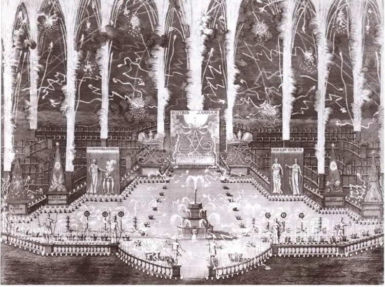 Фейерверк в честь коронации Анны Иоанновны 30 апреля 1730 года. Гравюра X. Вортмана по оригиналу Л. Каравака. 1730 г.