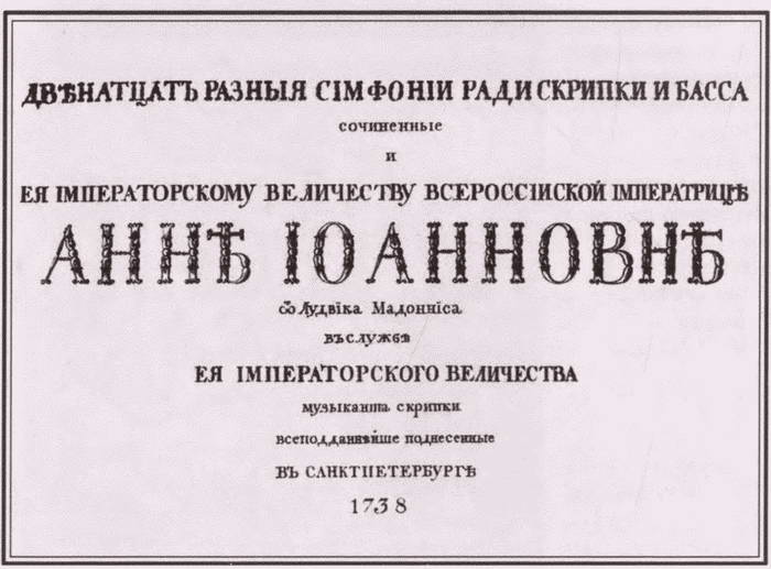 Альбом симфонических пьес итальянского композитора и скрипача Луиджи Мадониса, посвяшённых Анне Иоанновне. 1738 г.