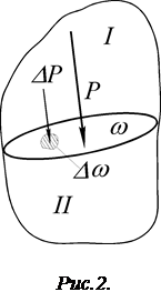 Розглянемо довільний об’єм рідини, що знаходиться в рівновазі під дією зовнішніх сил (рис 2.1). Розсічемо цей об’єм на дві частини деякою січною площиною w і відкинемо верхню частину І. Тоді на частину ІІ з боку відкинутої частини буде діяти певна сила Р, яка повинна бути перпендикулярною до січної площини. Цю стискуючу силу називають силою гідростатичного тиску. Якщо на січній площині виділити елементарну площинку Dw, то на неї буде діяти частина DР сили Р. Границя відношення DР/Dw називається гідростатичним тиском р в даній точці рідини: