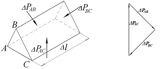 Щоб довести це виділимо в об’ємі рідини призму з основою у вигляді трикутника АВС (рис 2.2а) і замінимо дію зовнішнього об’єму рідини на її бокові грані відповідними силами. Оскільки призма знаходиться у стані рівноваги, то трикутник цих сил повинен бути замкнутим (рис 2.2б). Силовий трикутник подібний трикутнику АВС і тому