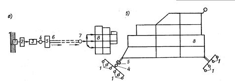 Рис.7.1. Загальний вигляд системи водопостачання з забиранням води з відкритого джерела (а) і з забиранням підземних вод (б): 1 – водозабірні споруди; 2 і 5 – споруди для підйому і перекачування води; 3 – споруди для очищення води; 4 – збірні резервуари; 6 – водоводи; 7 – водонапірна башта; 8 – водонапірна мережа