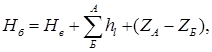 як сума втрат напору в послідовно з’єднаних ділянках трубопроводів. При розрахунках кільцевих мереж користуються такими законами: 1. Сума витрат води, що надходить до даного вузла, дорівнює сумі вузлового відбору з нього і витрат, які витікають з вузла. Це означає, що алгебраїчна сума витрат, що надходять у вузол (береться зі знаком плюс), і витрат, що витікають з вузла (беруться зі знаком мінус), повинна дорівнювати нулю. 2. В кожному замкненому колі мережі, утвореному лініями мережі, сума втрат напору на ділянках, де вода рухається за годинниковою стрілкою, дорівнює сумі втрат напору на ділянках, де рух води напрямлений проти годинникової стрілки, тобто алгебраїчна сума втрат напору в кільці дорівнює нулю. Існує багато методів розрахунку кільцевих мереж. Виконання таких розрахунків - трудомістка задача, і при значній кількості кілець її розв’язують за допомогою ЕОМ і аналогових пристроїв. Висота водонапірної башти і потрібний напір насосів. Висоту водонапірної башти або конррезервуара і напір насосів, які подають воду в мережу, визначають при найбільш несприятливих умовах (режимах) її роботи. Башта повинна мати таку висоту, щоб можна було забезпечити необхідні вільні напори в критичних (диктуючих) точках мережі, а напір насосів визначають з розрахунку подачі води в бак башти в баштових системах водопостачання чи забезпечення необхідного напору в найбільш високорозташованих і віддалених від насосної станції точках мережі – в безбаштових. На схемі водопроводу (рис.7.15) диктуючою є точка А з геодезичною (відмітка відносно поверхні землі)відміткою ZA. Водонапірна башта розташована в точці Б з геодезичною відміткою ZБ. Висота водонапірної башти (до дна бака, який встановлено на башті)