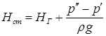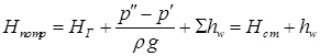 Різницю висот рівнів вільних поверхонь рідини в приймальному і напірному резервуарах називають геометричним напором НГ насосної установки. Для того щоб подати рідину по трубопроводах установки з примального (витратного) резервуара до напірного, необхідно витратити енергію на підйом рідини на геометричну висоту НГ, на подолання різниці тисків р//-р/ в резервуарах і на подолання сумарних гідравлічних витрат Σhw усмоктуючого і напірного трубопроводів. Таким чином потрібний напір установки