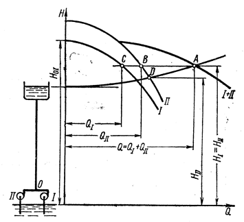 Спільне підключення насосів до однієї мережі використовують в тих випадках, коли потрібно суттєво збільшити продуктивність насосної установки або підвищити її напір. Можливі варіанти паралельного і послідовного з’єднання насосів. В першому варіанті збільшується подача рідини при майже незмінному напорі, в другому – напір потоку при незмінній подачі. Паралельна робота насосів можлива при однакових напорах насосів в кожний даний момент. На рис. 9.8 зображені: схема паралельного з’єднання двох різних насосів, їх характеристики Hн=f(Q) (криві І і ІІ), а також характеристика насосної установки Hпотр =f(Q). Для отримання робочої точки потрібно побудувати сумарну характеристику цих насосів НΣ=f(Q) (криву І+ІІ), для чого складають абсциси (подачи Q) точок кривих І і ІІ при однакових ординатах (напорах НН). Точка А перетину кривих Hпотр =f(Q) і І+ІІ буде робочою точкою. Абсциса точки А визначає сумарну подачу Паралельне включення насосів виправдовує себе економічно лише тоді, коли характеристика насосної установки Hпотр.=f(Q) є положистою кривою.