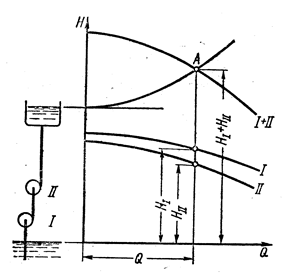 Послідовна робота застосовується в тих випадках, коли один насос не може забезпечити потрібного напору. При цьому подача насосів однакова, а загальний напір дорівнює сумі напорів обох насосів при одній і тій же подачі. На рис 9.9 зображена схема послідовного включення двох різних насосів, характеристики яких показані кривими І і ІІ. Сумарну характеристику (крива І + ІІ) насосів одержують складанням ординат кривих напорів І і ІІ обох насосів. Перетин сумарної характеристики насосів з характеристикою насосної установки дає робочу точку А. Положення її визначає сумарний напір HI+HII обох насосів при подачі Q. Якщо через точку А провести вертикальну пряму, то при перетині цієї кривої з кривими напорів І і ІІ отримаємо напори насосів HІ і HІІ. Необхідно мати на увазі, що послідовне з’єднання кількох насосів менш економічне порівняно з використанням одного високонапірного насоса. Це пов’язане з тим, що загальний К.К.Д групи послідовно з’єднаних насосів дорівнює добутку К.К.Д кожного з насосів.