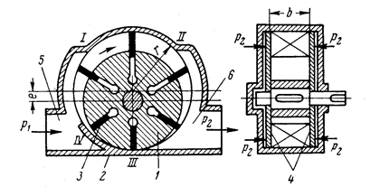 Пластинчасті гідромашини – це роторні гідромашини з рухомими елементами у вигляді ротора, який здійснює обертальний рух, і пластин (шиберів), що обертаються разом з ротором і в той же час здійснюють зворотно-поступальний рух в пазах ротора. Пластинчасті гідромашини бувають однократної і багатократної дії, одноступінчасті і багатоступінчасті. Гідромашина (насос або гідромотор) однократної дії (рис.9.17) складається з ротора 1, вісь обертання якого, зміщена відносно осі статора 2 на величину ексцентриситету е. В пазах ротора встановлені пластини 3, які притискуються до внутрішньої поверхні статора або тиском рідини, або пружинами. Для відокремлення усмоктуючої порожнини 5 від нагнітальної 6 в статорі передбачені ущільнювальні виступи І-ІІ і ІІІ-ІV. Ущільнення ротора з торців забезпечують диски 4.