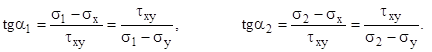 Положения главных площадок могут быть найдены из уравнений (3). Будем определять две площадки через тангенсы соответствующих углов наклона. Разделим их на