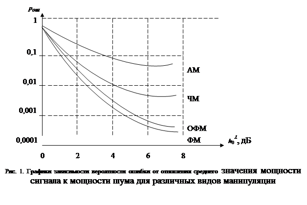 Из полученных выражений видно, что по сравнению с двоичной АМ для двоичной ЧМ эквивалентная энергия сигнала Eэ =½ s 1- s 0½2 в два раза больше, а для двоичной ФМ – в четыре раза больше. Графики зависимости вероятности ошибки от отношения среднего значения мощности сигнала к мощности шума для различных видов манипуляции выглядят следующим образом: