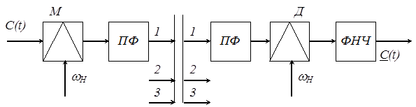 Канальные сигналы в системах с ЧРК формируются из первичных информационных сигналов путем преобразования их спектров так, чтобы каждый канальный сигнал занимал некоторый участок спектра, не перекрывающийся с полосами частот других канальных сигналов. В принципе, для такого преобразования можно применить различные виды модуляций токов несущих частот. В современной аппаратуре для этого в основном используется однополосная модуляция. Достоинство такого метода формирования канального сигнала заключается более рациональном использовании спектра и мощности каналообразующего устройства. Канальные сигналы занимают такие же диапазоны частот, как и передаваемые первичные сигналы D w = D W. Еще более важным достоинством является то, что коэффициент использования мощности передающего устройства увеличивается в несколько раз. Устранение колебаний несущей частоты из канальных сигналов дает возможность снизить мощность на выходе групповых усилителей многоканального сигнала до приемной величины. Структурная схема формирования однополосного канального сигнала показана на рис. 3.