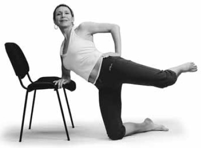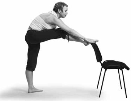 • Тонизировать мышцы ног. • Укрепить и растянуть внутреннюю часть бедер. Как выполнять • Встаньте лицом к стулу, руками возьмитесь за спинку. • Согните в колене правую ногу и стопой этой ноги обопритесь о спинку стула. • Отклоняя таз назад, начинайте выпрямлять правую ногу. • Выполните 50 покачивающе‑растягивающих движений. • То же самое упражнение выполните с другой ногой.