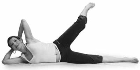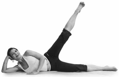 • Лягте на бок, вытянитесь в одну линию, голову положите на согнутую в локте руку. • На вдохе прижмите живот к спине и начните поднимать верхнюю ногу вверх. Тяните носок, всю ногу растягивайте от бедра. • На выдохе вернитесь в исходное положение. • То же самое выполните, лежа на другом боку. • Таз и ноги при выполнении этого упражнения должны быть максимально напряжены.