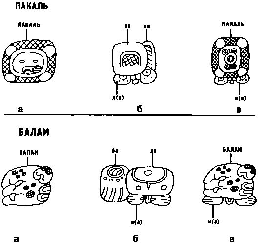 Различные способы написания слов Пакаль и Балам а) в виде отдельного логографа; б) фонетически; в) комбинированное – логограф + фонетическое дополнение