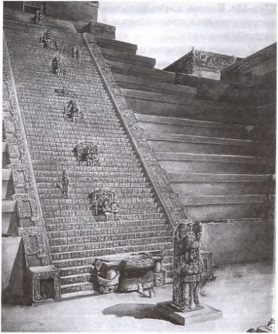 Реконструкция лестницы с письменами, выполненная Татьяной Проскуряковой. Письмена рассказывают об истории Копана. Лестница была построена около 755 г. правителем по имени Небо‑Раковина. В его честь у подножия лестницы установлена стела.