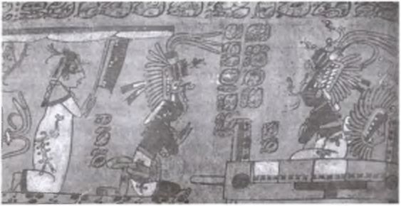 Сцена, изображенная на сосуде: одного майяского правителя принесли в открытом паланкине в гости к другому владыке. Иероглифы в центре рисунка до сих пор не расшифрованы. Горизонтальный ряд иероглифов вверху содержит обычный для той эпохи текст: в нем воздается хвала самому сосуду и говорится о том, что он предназначен для напитка из какао‑бобов