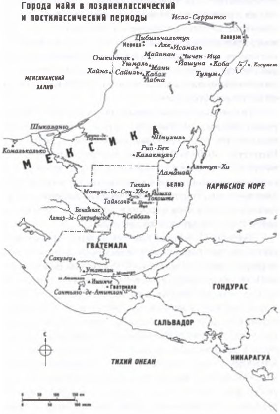 Сегодня, когда прочитана большая часть сохранившихся иероглифических надписей, мы можем с точностью указать момент смерти того или иного города. Процесс угасания начался с долины реки Усумасинты. В Бонампаке последняя «опубликованная» дата, словно остановившиеся часы, указывает нам на 792 год. Последнее известие, оставленное в Пьедрас‑Неграс, датировано 795‑м годом; великий Паленке «уснул» четырьмя годами позже, а последний голос в Йашчилане замолк в 808 году. Затем цивилизационный коллапс накрыл остальные районы империи, подобравшись к самому центру – Петену. Киригуа прекратил свое существование как город в 810 году, Копан – в 822‑м. Последняя подтвержденная дата в Калакмуле – 810 год, хотя упоминание о нем встречается и в 849‑м, правда, в соседнем Сейбале. Кончина Караколя датирована 859 годом; Тикаль перестал подавать признаки жизни в 889 году. Самая последняя на сегодняшний день прочитанная дата относится к 909 году, и обнаружена она в отдаленном городке Тонина в мексиканском Чьяпасе. Надписи, как всегда, повествовали о военных победах, захваченных в плен врагах и жертвоприношениях. И ни одного слова о надвигающейся катастрофе! Ничего подобного не предвещали и надписи на керамике. Что же все‑таки произошло? Еще полвека назад бытовало множество версий случившегося: эпидемия, оскудение сельхозугодий, землетрясение, жестокое нападение других народов, крестьянские восстания. Ученые очень осторожны в гипотезах. Главная заключается в том, что накопились разрушительные противоречия между возросшими потребностями городского общества и сельскохозяйственными возможностями, да и, видимо, сами крестьяне не желали «кормить город». Довольно точно установлено, что пик общей численности майя пришелся приблизительно на 800‑й год. Конечно, очень трудно подсчитать и оценить примерное число людей, живших в каком‑либо месте более тысячи лет назад, но ученые нашли методы. Так, в городском ядре Тикаля на площади 120 квадратных километров могло проживать до 65 тысяч человек; еще около 30 тысяч проживало в предместьях в радиусе 10 километров от центра города. Раскопки и изыскания, проведенные в Калакмуле, дают приблизительно те же цифры. Вне всякого сомнения, эти два города – крупнейшие на всей юкатанской равнине позднеклассического периода. Ненамного от них отстал Караколь.