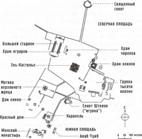 Чичен‑Ица никогда не была «потерянным» городом. Когда на Юкатан прибыл Диего де Ланда, население уже покинуло город, однако паломники со всего Северного Юкатана по‑прежнему приходили сюда для того, чтобы бросить в Священный Сенот какую‑либо ценную вещицу. Центр Чичен‑Ицы условно можно разделить на две части, в каждой из которых главенствует особенный, неповторимый архитектурный стиль. В южной части города расположены группы зданий Женского монастыря и Акаб‑Тциб, украшенных в типичной северо‑юкатанской манере: фасады декорированы мозаикой, а по углам зданий размещены вытесанные маски бога Чака. Другие здания южного сектора – Красный дом и дом Оленя – представляют собой возведенные на невысоком фундаменте храмы и сравнимы с «крестовой группой» зданий в Паленке как по дизайну, так и по относительному местоположению. Единственное не типичное по своему внешнему виду здание – «Караколь» (в переводе с испанского «улитка»), но иным оно и быть не могло, потому что это астрономическая обсерватория. В северной части города архитектурный стиль и размеры большинства зданий разительно меняются. В центре просторной площади возвышается классическая 30‑метровая пирамида Эль‑Кастильо (Кукулькана) с плоской площадкой на вершине и лестницами на всех четырех боковых гранях. С северной стороны вход в пирамиду охраняют две колонны в виде змей, покрытых перьями. Змеиные головы находятся на уровне пола, а хвосты поддерживают дверную балку. В 100 метрах к востоку от Эль‑Кастильо возвышается внушительный Храм воинов. С двух сторон от храма возведено множество отдельно стоящих колонн, все они украшены изображениями воинов и жрецов. Первоначально колонны поддерживали деревянную крышу, покрытую гипсовой штукатуркой. Врата Храма воинов также сторожат пернатые змеи, почти такие же, как и у входа в Эль‑Кастильо.