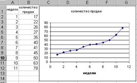 1. Ввод исходных данных задачи. В ячейки A1 и B1 введем заголовки исходных данных, в ячейки A2:A12 – номера недель, а в ячейки B2:B12 – соответствующее количество продаж (фактические данные) (рис. 2.11).