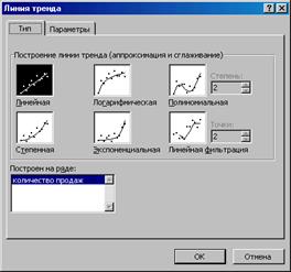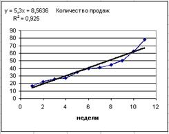 В окне Линия тренда на вкладке Тип выберем Линейная (см. рис. 2.13), а на вкладке Параметры нужно установить следующие флажки: · показывать уравнение на диаграмме; · поместить на диаграмму величину достоверности аппроксимации (R^2). После нажатия кнопки OK на графике наряду с фактическими значениями количества продаж будет показана линейная функция тренда и ее уравнение. Уравнение и коэффициент детерминации можно выделить щелчком левой кнопки мыши и перетащить на то место графика, где их лучше видно (рис. 2.14).