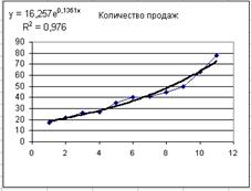 Рис. 2.15. Экспоненциальная линия тренда, наиболее точно 5. Выполнение прогноза. Поскольку нужно выполнить прогноз на 3 недели вперед, допишем номера этих недель (12, 13 и 14) в столбец A. В соответствующие ячейки в столбце B следует занести формулы вычисления теоретического значения по функции тренда. При этом можно записывать сразу числовые значения параметров. Обратите внимание, что уравнение экспоненциальной кривой, полученное на графике, имеет вид Y = a × ebt. Поэтому для его задания необходимо использовать функцию EXP(), т. е. в ячейку B13 нужно записать формулу =16,257*EXP(0,1361*A13). Затем эту формулу можно скопировать в ячейки B14 и B15 с помощью автозаполнения. В результате получим в ячейках B13:B15 следующие прогнозы: · на 12-ю неделю – 83 продажи; · на 13-ю неделю – 95 продаж; · на 14-ю неделю – 109 продаж. Date: 2015-07-25; view: 462; Нарушение авторских прав |