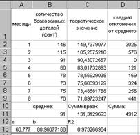 5. Выполнение прогнозов. Для того, чтобы сделать прогноз, нужно подставить в уравнение тренда значение момента времени, относящееся к будущему. Введем в ячейки A15 и A16 номера следующих двух месяцев (9 и 10). В соответствующие ячейки столбца С запишем формулы расчета по линии тренда, т. е. в ячейку С15 введем формулу =$A$13+$B$13/A15. Скопируем данную формулу в ячейку С16. Результат вычисления по этим формулам показан на рис. 2.21. Таким образом, прогноз количества бракованных деталей на 9-й месяц составляет примерно 71 деталь, а на 10-й месяц – примерно 70 деталей.