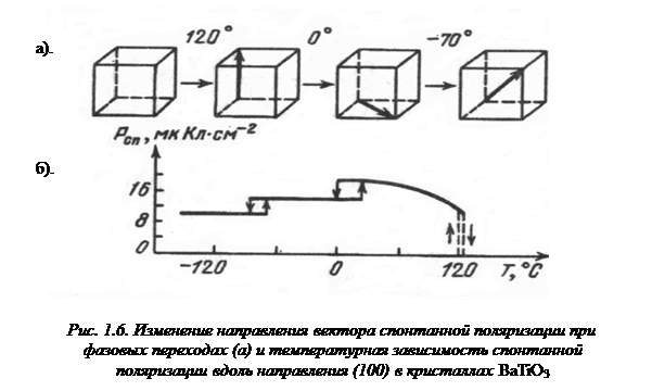 Основу структуры представляют кислородные октаэдры, в центре которых расположены ионы титана. Ионы кислорода центрируют грани куба, образованного ионами бария (рис. 1.5, б). Размеры элементарной ячейки больше удвоенной суммы ионных радиусов титана и кислорода, поэтому ион титана имеет некоторую свободу перемещения в кислородном октаэдре. При высоких температурах (более 120оС) тепловая энергия иона титана достаточна для его непрерывного перемещения от одного иона кислорода к другому, его усредненное местоположение – в центре элементарной ячейки. При понижении температуры уменьшается кинетическая энергия иона титана и при некоторой критической температуре – температуре перехода в спонтанно поляризованное состояние, называемой температурой Кюри Т к, он локализуется вблизи одного из ионов кислорода (для BaTiO3 Т к = 120оС). Симметрия в расположении частиц нарушается, и элементарная ячейка приобретает дипольный момент. В соседней ячейке ион титана смещается к отрицательному полюсу образовавшегося диполя, и соседние элементарные ячейки становятся спонтанно поляризованными. Одновременно идет деформация кристаллической решетки – кубическая решетка становится ромбоэдрической. Строго говоря, у кристалла BaTiO3 наблюдаются три фазовых перехода. По мере понижения температуры происходит переход от кубической к тетрагональной, затем к ромбической и ромбоэдрической модификациям с соответствующим изменением спонтанной поляризации (рис. 1.6).