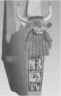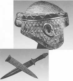 Золотой шлем и золотой кинжал с ножнами из гробницы. Ур