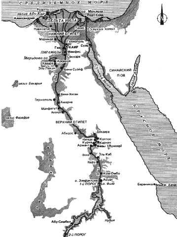 Египет – одна из древнейших цивилизаций. Древние египтяне называли свою страну «Кемет» (Qemt), что значит «Черная». Иногда они добавляли к эпитету «Черная Земля» (черной почве Нильской долины) еще и «Красная Земля» (красный покров пустынь). Ближе к современному названию все же греческое «Айгюпетс» (от искаженного «Хеткаптах»). Так именовали греки государство Нижнего Египта со столицей в Мемфисе. Было у Египта и еще одно смысловое значение – «загадка», «тайна» (Бадж). Возникшая в горловине Нильской долины земля чем‑то напоминает горло волшебного кувшина, откуда появился вдруг могущественный джинн. Нил, изливая с дивным постоянством воду, восстанавливая плодородие почвы, дает жизнь всем, кто тут обитает. География определила политику и этнологию. Брестед и Тураев отмечали: «Мир египтянина был, таким образом, резко ограничен: глубокая и узкая долина, несравненная по плодородию, и по обе стороны ее две безжизненные пустыни, являющие собой замечательное окружение, – местоположение, какого нет больше во всем мире. Подобное окружение оказывало могущественное влияние на дух и мышление египтянина, обусловливая и определяя его воззрение на мир и его понимание таинственных сил, управляющих им». Племена были изолированы друг от друга границей реки и рамками пустынь. Египет состоял из двух частей – Верхний и Нижний Египет. Поэтому народ называл свою землю «Две страны». Одна часть соответствовала Дельте, другая – долине Нила.